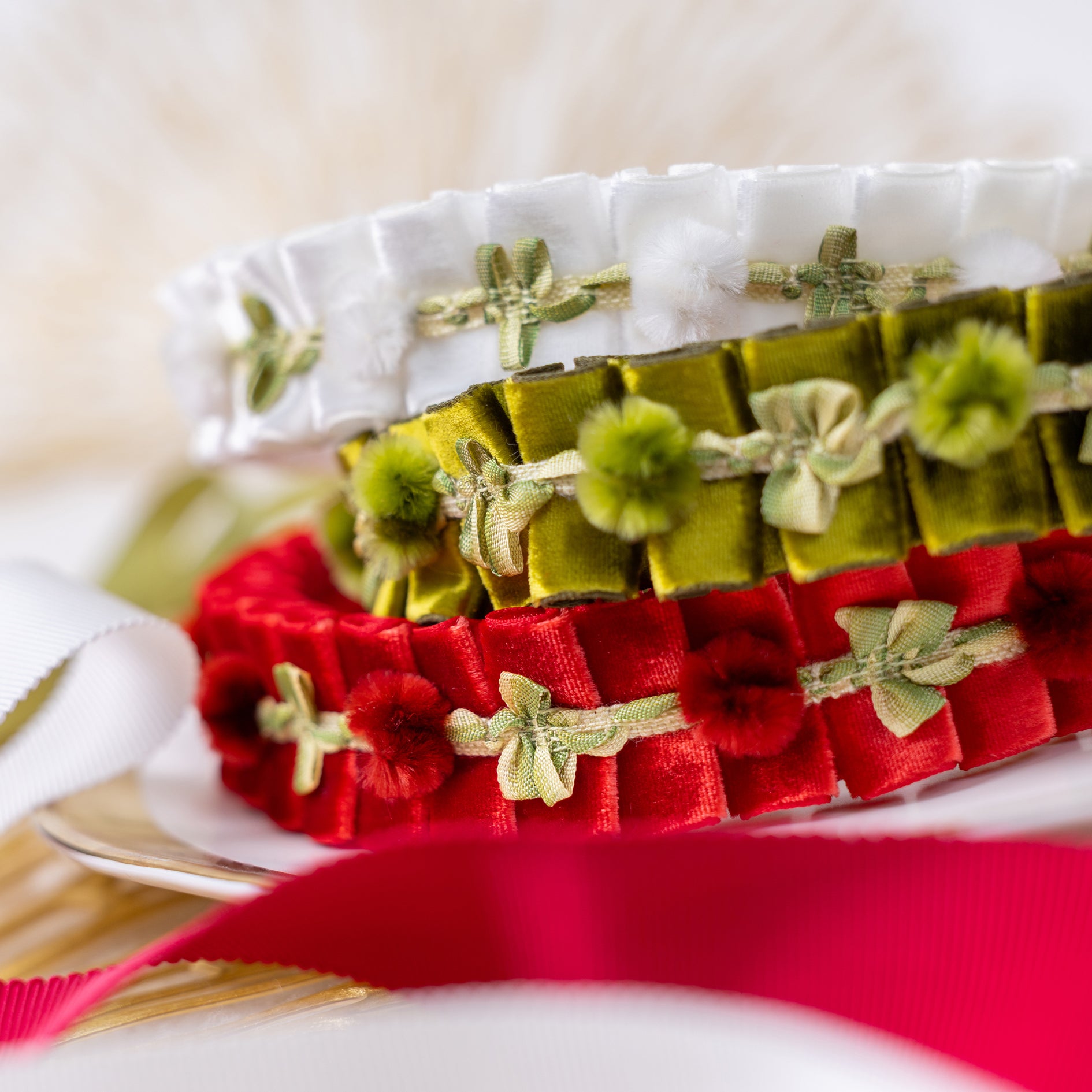 Delicately layered velvet ribbons paired with softly blooming pom-pom flowers.